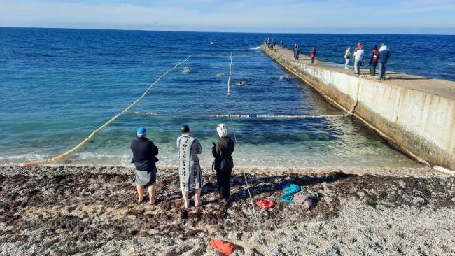 В Феодосии члены клуба зимнего плавания «Скиф» сегодня отметили наступление 2019 года традиционным купанием в Чёрном море. Температура морской воды — плюс восемь градусов.