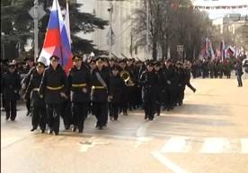 Строевым шагом по центральным улицам города прошли почти четыре сотни военнослужащих. Следом за военными шествовали участники севастопольской самообороны, казачьи объединения, представители мотоклуба «Ночные волки», бойцы спецотряда «Беркут».