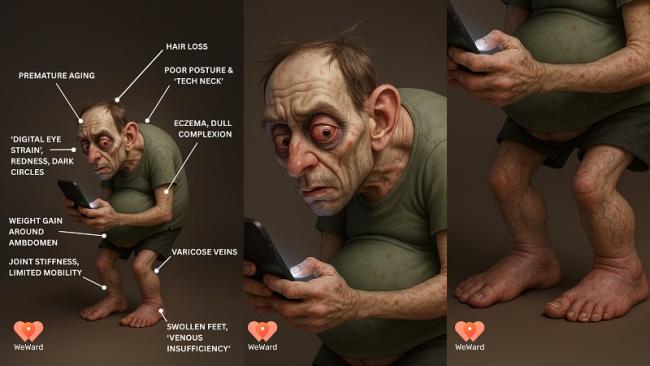 Сэм также постоянно смотрит в экраны гаджетов, что приводит к постоянному наклону головы вперед и искривлению верхней части спины. Постоянный синий свет от экранов гаджетов вызывает ухудшение зрения, а также приводит к преждевременному старению и гиперпигментации кожи.