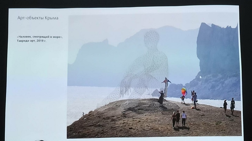 Постепенно перешли к Крыму, а затем и к Севастополю. В Крыму несколько интересных объектов появилось в рамках Тавриды-арт – например, этот человек на берегу. Его можно считать символом стремления человека к чему-то вечному и небытовому. А можно трактовать как-то иначе – простор для воображения тут огромный.