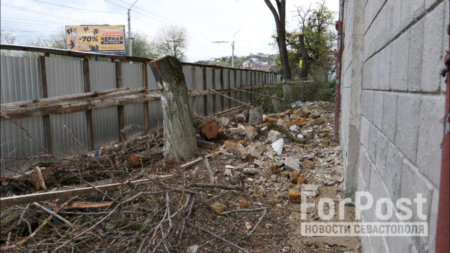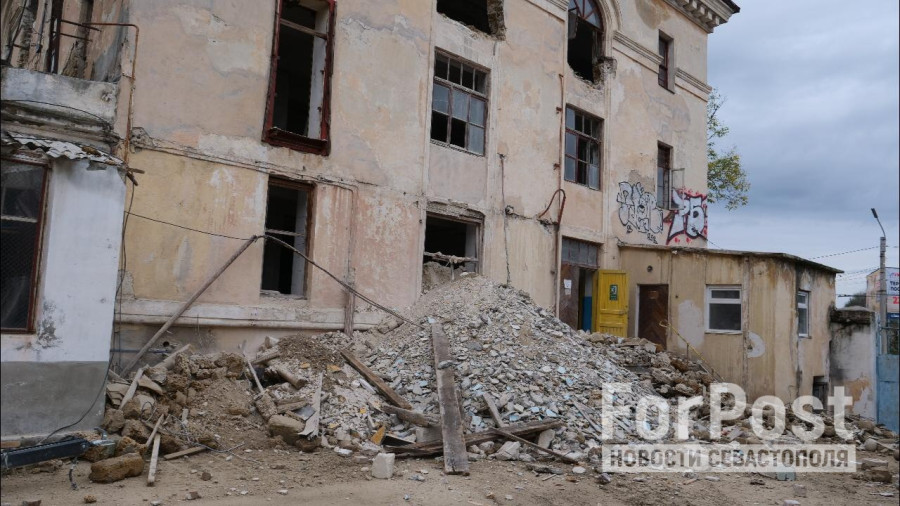 На территории бывшего Севастопольского хладокомбината на Портовой улице уже неделю идут демонтажные работы. За появившимся металлическим забором спилили несколько деревьев перед фасадом, в самом здании небольшой экскаватор бодро демонтирует внутренние элементы, высыпая обломки через грубо расширенные оконные проёмы.