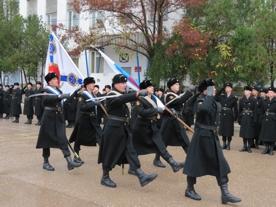 После торжественного подъема Государственного флага России на плацу бригады морской пехоты прошел митинг. Первым на нем выступил командующий Черноморским флотом контр-адмирал Александр Федотенков. Он поздравил морских пехотинцев с началом нового учебного года и напомнил некоторые славные страницы истории из жизни Черноморского флота и морской пехоты, в частности. Командующий ЧФ напомнил о беспримерном подвиге десанта под командованием старшего лейтенанта Константина Ольшанского в годы Великой Отечественной войны. Десантная операция, проведённая 384-м отдельным батальоном морской пехоты 26 марта 1944 года в порту города Николаева навсегда вошла в летопись Черноморского флота. Константин Ольшанский оборонял город русской воинской славы - Севастополь. Затем был направлен в электромеханическую школу - готовить специалистов для флота. В начале 1943 года он - командир роты автоматчиков 384-го отдельного батальона морской пехоты Черноморского флота. Участвовал в обороне города Ейска, освобождении городов Таганрога, Мариуполя.