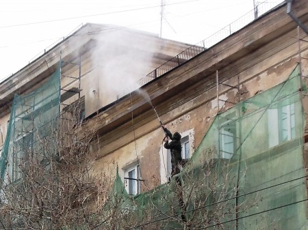С высоты пятого этажа на прохожих обрушились клубы песка и пыли вперемешку с грязной жижей. Это заработал аппарат, при помощи которого «умные» головы от строительства стали снимать никогда не обновлявшийся штукатурный слой, осыпая его на головы пешеходов. Именно в такое время дня и именно в таком «неудобье»!