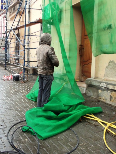 Вчера, несмотря на дождь, временами переходящий в ливень, и срывающийся снег, высотные работы на скользких незакреплённых досках строительных лесов продолжились. Из положительных подвижек увидела только новую зелёную сетку, затягивающую дополнительное постранство и – не более!