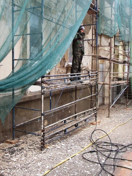 Безусловно, ручное сбивание старой штукатурки - дело трудоёмкое! Но судя по количеству работников, бесцельно слоняющихся возле стройплощадки, «напряжёнки» с рабсилой здесь как раз-таки не было.