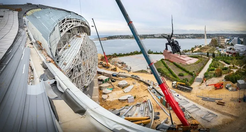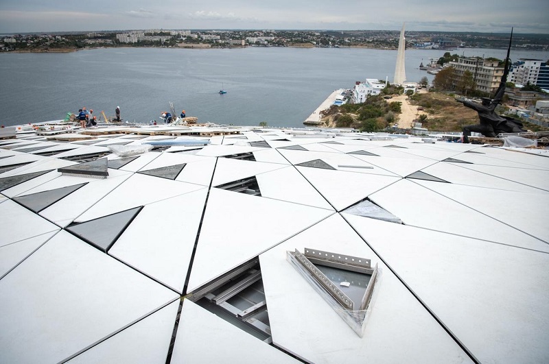 «По всему периметру здания стеклопакеты, фибробетонная облицовка, шпонированные панели — уникальные и не повторяются, а их монтаж можно сравнить с собиранием пазла, где у каждой детали есть своё место», — описал этот процесс глава Севастополя.