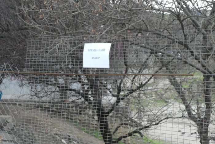 Первый раз, т.е. вчера, зебры хватило на полчаса, т.к. только ушли работники, приехала машина - вышка ремонтировать табло, которое установлено на пл. Захарова. А заезжали через причал, между этими красными столбиками, как раз по зебре :) Смешали "зёбру" с грязью. Сегодня опять нанесли краску и догадались оставить вокруг ограждение. Потом спилили забор на левой стороне и перенесли его на правую сторону. А на том месте натянули сетку -рабицу. Надпись на ней гласит "Временный забор".