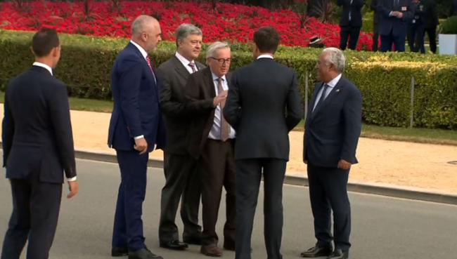 Во время прогулки Юнкера (видимо, под мухой) приходилось поддерживать под локоть, а в какой-то момент он едва не упал на президента Украины Петра Порошенко.