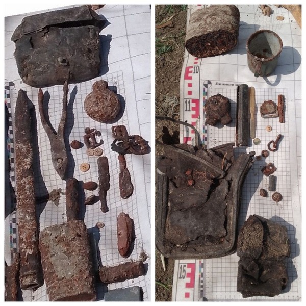 При этом все остальные личные вещи и предметы амуниции погибших были не тронуты. Благодаря этому поисковикам удалось найти малую сапёрную лопатку, СШ-39 (стальной шлем 1939 года — Прим.), патронные подсумки, большие и малые пуговицы к обмундированию РККА, пуговицы нательного белья, ботинки, противогаз и бачки к нему, эмалированные кружку и котелок и подвесы к нему, звёздочку к головному убору, рамочные пряжки ремней, коробочку из-под запалов РГД-33 (ручная граната Дьяконова образца 1933 года — Прим.), штык-нож к винтовке Маузер иранского производства, перочинный нож, две опасные бритвы, зубную щётку, монету номиналом в три копейки 1936 года, карманное зеркало, пинцет для бровей, круглую коробочку с вазелином.