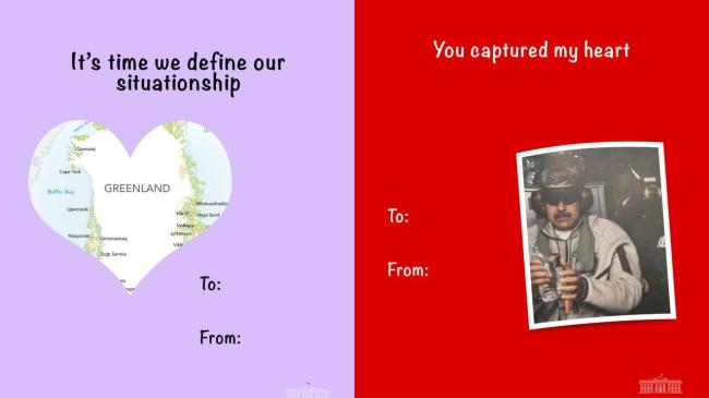 На Гренландии креатив Белого дома не закончился. Ещё одна валентинка досталась президенту Венесуэлы Николасу Мадуро. На фото — политик с завязанными глазами и связанными руками. Речь идёт о его недавнем похищении американцами. Подпись под снимком иронично обыгрывает ситуацию: «Ты захватил моё сердце».