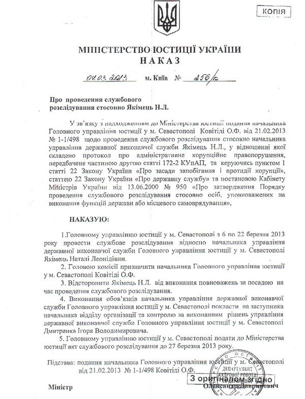 Приказом министра юстиции Украины начальник ГУ юстиции в Севастополе Ольга Ковитиди проверит деятельность бывшего начальника ОГИС Севастополя Натальи Якимец