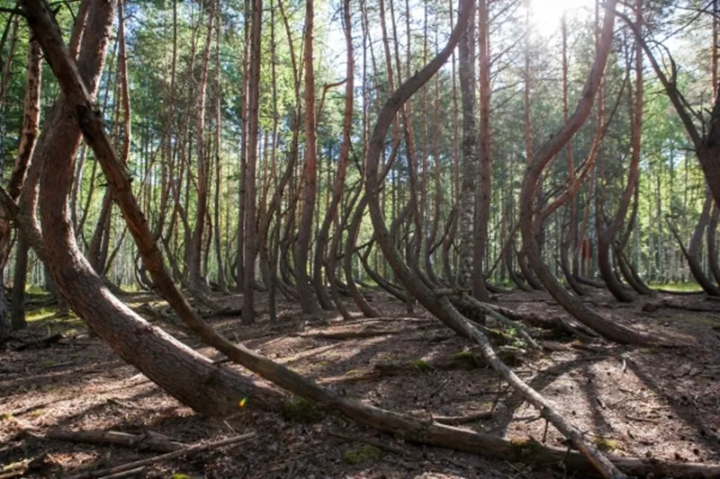 Третий в рейтинге — «Танцующий лес» на Куршской косе. Искривлённые в петли и зигзаги стволы деревьев в этом месте породили слухи об аномальной зоне, притягивающей странные энергии.