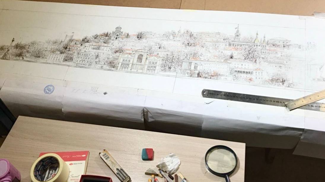 Как рассказал ForPost автор работы, над эскизом он трудился почти без перерывов. На создание графической композиции ушло около десяти дней, при этом несколько суток художник спал всего по три часа, работая по ночам до рассвета. Эскиз создавался прямо в Школе искусств, где работает Дудченко: на полу развернули почти четырехметровое полотно бумаги, которое пришлось буквально выкраивать и натягивать вручную.