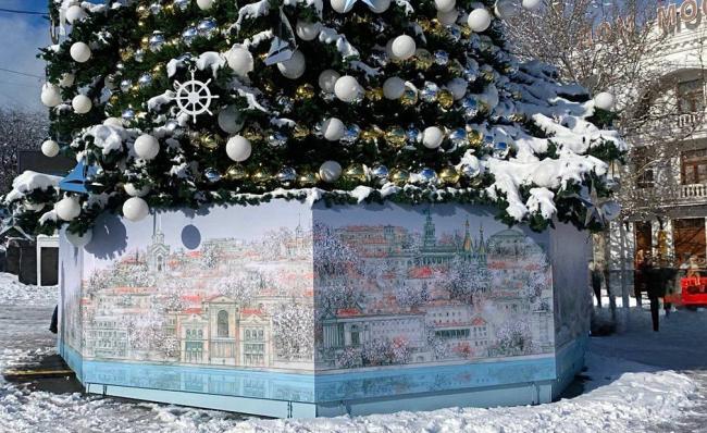 Главную новогоднюю елку Севастополя в этом году украшает панорамное панно, созданное по эскизу севастопольского художника, академика Российской академии художеств Николая Дудченко. Большая круговая композиция с видами города стала одним из самых теплых и заметных элементов праздничного оформления центра.