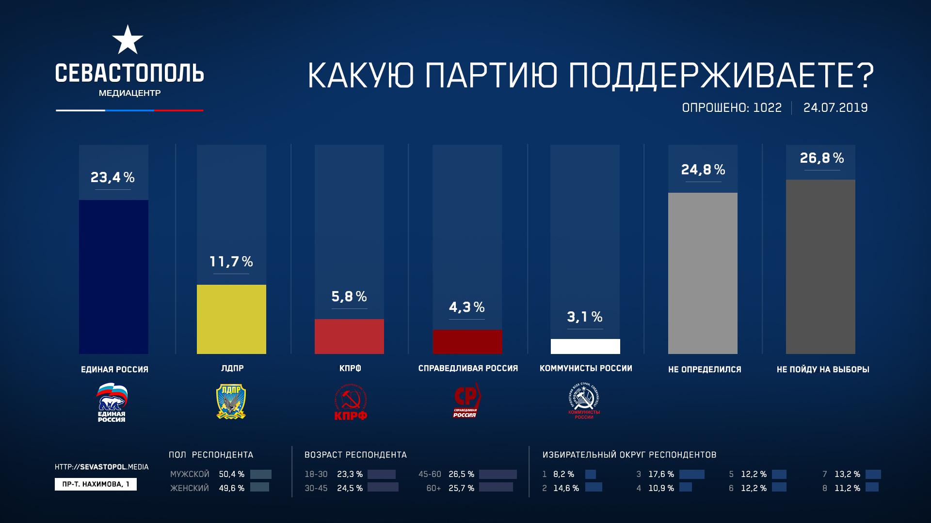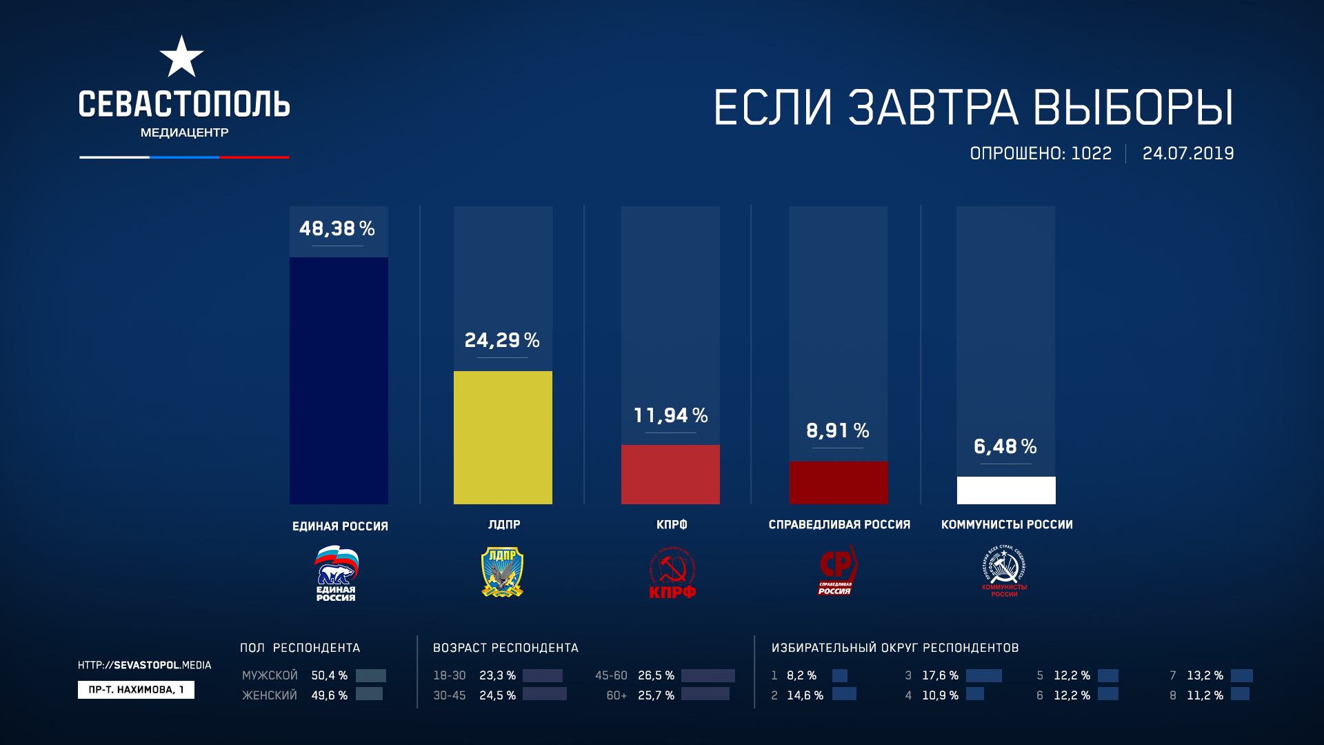 После выноса «за скобки» неопределившихся и тех, кто не пойдет на выборы, по состоянию на данный момент «ЕР» набрала бы на выборах 48,38%, ЛДПР — 24,29%, КПРФ — 11,94%, «Справедливая Россия» — 8,91%, «Коммунисты России» — 6,48%.