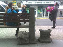 На фактурные железобетонные скамьи с грифонами и помпезные урны в стиле «ампир», обвитые лавровыми венками, обращали внимание многие. Когда они появились на этой остановке, кто-то говорил: «Китч…», кто-то: «И за такие спасибо», но все вместе надеялись, что они антивандальные. Тогда нам обещали, что немалые деньги, израсходованные городом, будут потрачены не напрасно. Однако суровая городская действительность в очередной раз опровергла слова больших начальников: бетон без надёжного металлического каркаса не прослужил и пару лет.