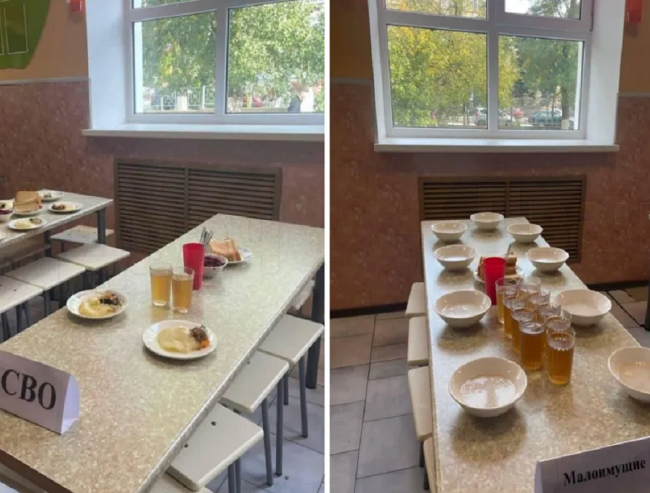 В Азове Ростовской области столы в школьной столовой разделили для малоимущих, и для детей участников СВО. На столах были разные блюда, а также таблички, для кого они предназначены.