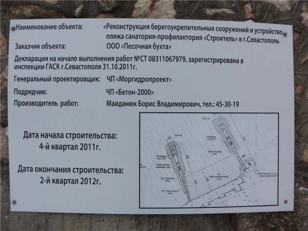 Информационный щит на стройке сообщает о том, что производится реконструкция берегоукрепительных сооружений и устройство пляжа пансионата. Остаётся ли актуальным на сегодняшний день строительство набережной – нам, общественникам, не известно. Строительство ещё одного 60-метрового мола на границе санатория с пляжем «Солнечный» и удлинение в два раза уже существующего мола на границе с пляжем «Песочный» не может не привести, с нашей точки зрения, к изменению всей гидрологии бухты. Какой экологический ущерб может быть нанесён в этом случае бухте и пляжам ни жителям, ни общественникам не известно.