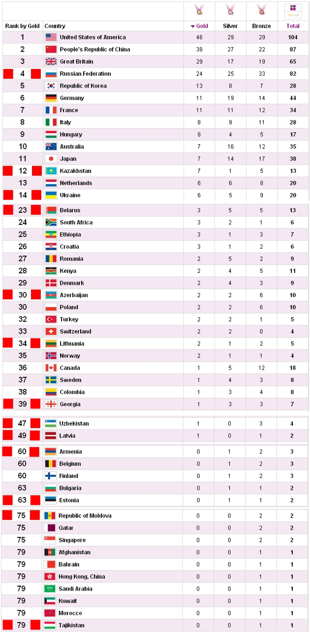 Так выглядит сводная таблица Олимпиады 2012. Красными квадратами отмечены страны, ранее входящие в состав единого советского государства.