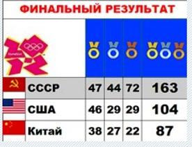 Наша идея наблюдать за успехами спортсменов виртуальной сборной СССР оказалась достаточно занимательной и добавила интриги. Несмотря на то, что сборная России впервые утратила место в тройке, уступив его хозяевам летней Олимпиады, сборная бывших советских республик в целом показала очень приличные результаты как по общему количеству медалей, так и по золотому первенству.