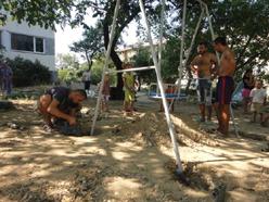 Год назад депутатом Горсовета Сергеем Гоголинским была построена небольшая спортивная площадка. В этом году он решил дополнить их детской горкой и качелями, помочь ему взялись активисты ОО «Скверы Гавена» и жители близлежащих домов.