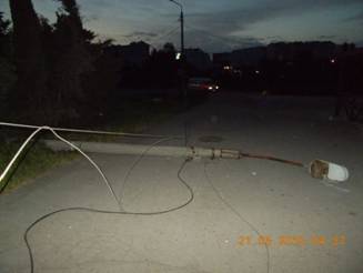 В четверг 21.05.2015 г. в 04 ч.05 мин. в диспетчерскую службу ГУПС «Горсвет» от дежурного ГАИ поступило сообщения о ДТП, произошедшем на перекрестке ул. Борисова и ул. Гер. Бреста, в результате которого была сбита опора наружного освещения №27, поврежден светильник, сорваны изоляторы с траверс, оборван провод АС.