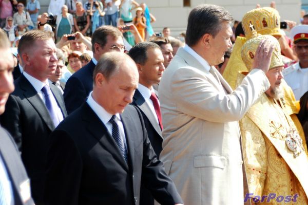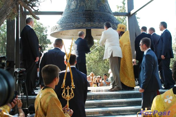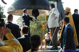 Честь первыми разбудить глас 13-тонного хозяина херсонесской звонницы была предоставлена главным гостям торжества - президенту России Владимиру Путину и президенту Украины Виктору Януковичу.