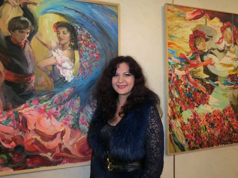 Я ознакомился с выставкой. Прекрасные работы, полные жизни и экспрессии. Должен отметить, что прекрасна и талантлива автор картин, которую мне удалось сфотографировать возле её работ.