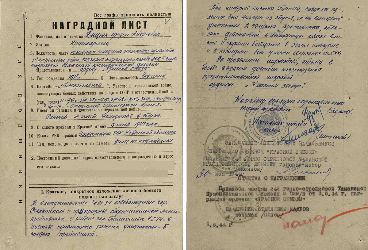 В наградных документах значатся бои 7 мая за высоту Горную и 12 мая на мысе Херсонес.