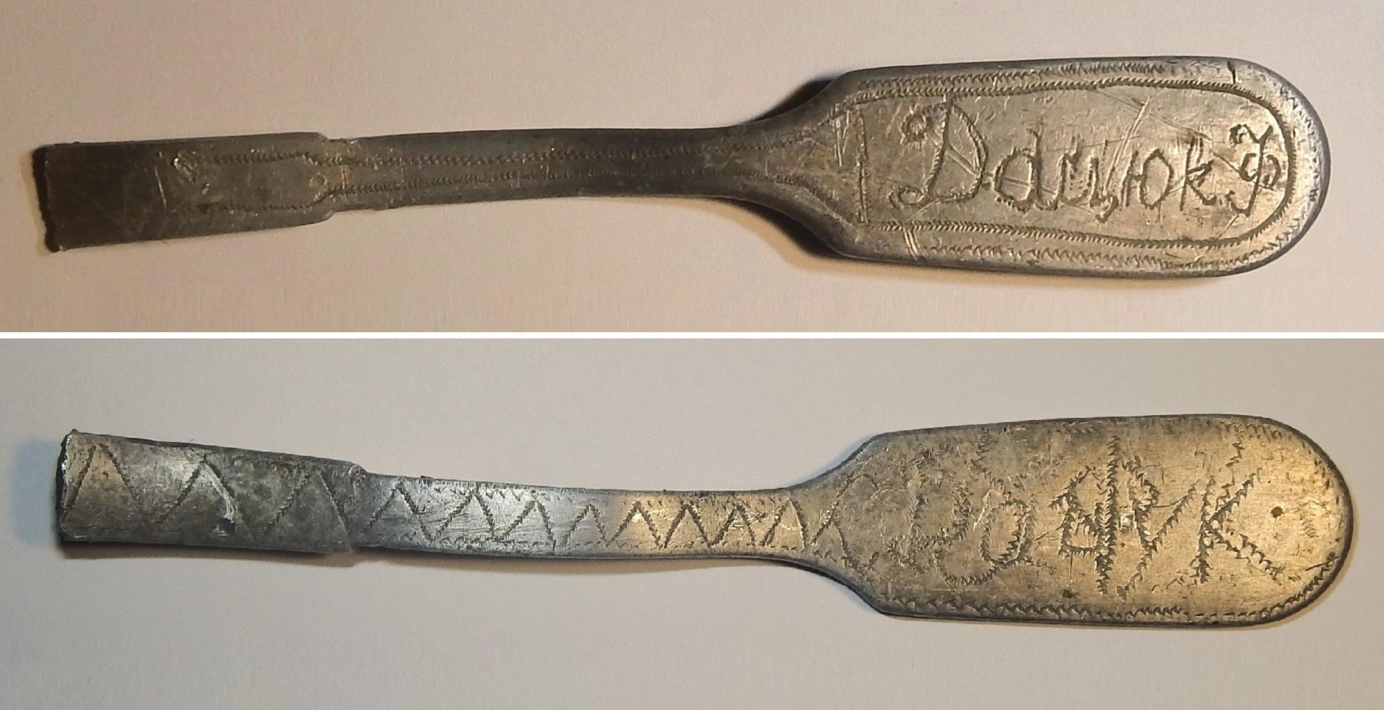 А вот ложку подписать совсем не грех — вещь личная, важная, и всегда за голенищем сапога. Так что спасёт от «без вести», если вернуться живым не судьба.