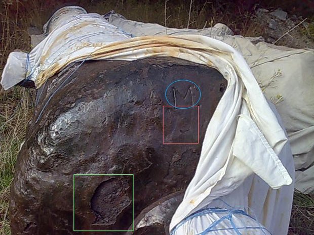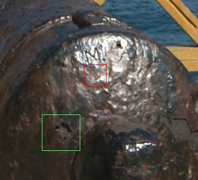 Например, если присмотреться, на обеих фотографиях можно увидеть, как под буквой «М» проступает едва видимый символ в виде латинской буквы «N» (в красном квадратике). Будь это следствием коррозии или царапина, но однозначно такая метка не могла случайно повториться на двух различных орудиях. Далее - на пушке из Артбухты есть глубокая ямка от коррозии (зеленый квадрат), на пушке с мыса Айя на этом месте тоже коррозионные повреждения, но больше. Если бы было наоборот, то это однозначно различные орудия. А так все логично, коррозия и удары во время перевозки и разгрузки сделали свое дело – рана на теле пушки стала больше.