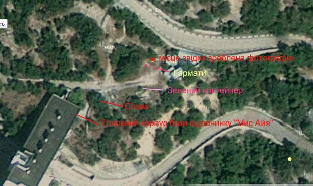 А вот фото с «google.maps». На нем отмечено место, где лежат орудия, видно «Крышу» зеленого контейнера, сосну и корпус базы отдыха «Мыс Айя».