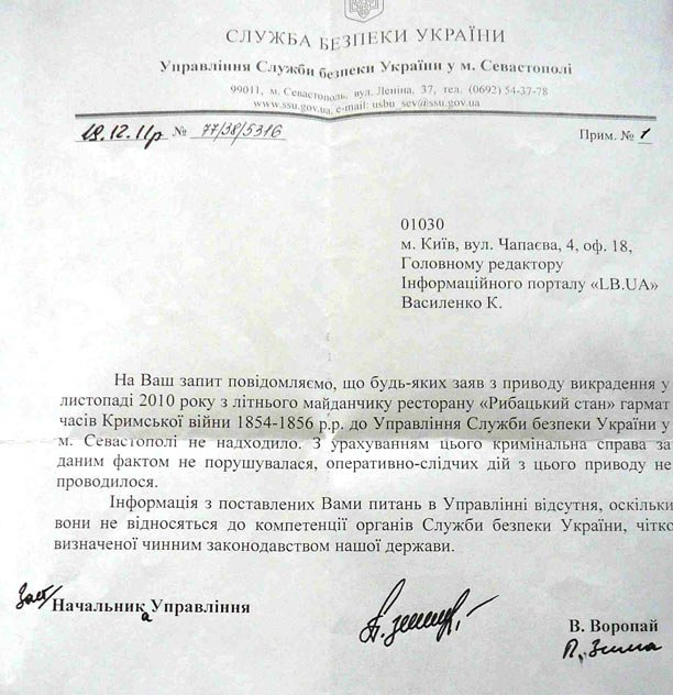 LB.ua посылало запросы в отношении пушек в Морпорта и СБУ Севастополя. Порт проигнорировал наше письмо, СБУ Севастополя прислало ответ: «оперативно-следственных действий не проводилось». В то же время работники ресторана «Рыбацкий стан», музея «Михайловский равелин» и Национального музея героической обороны Севастополя дружно рассказывали журналисту, что СБУ искала пушки, собирали объяснения об обстоятельствах их исчезновения ...
