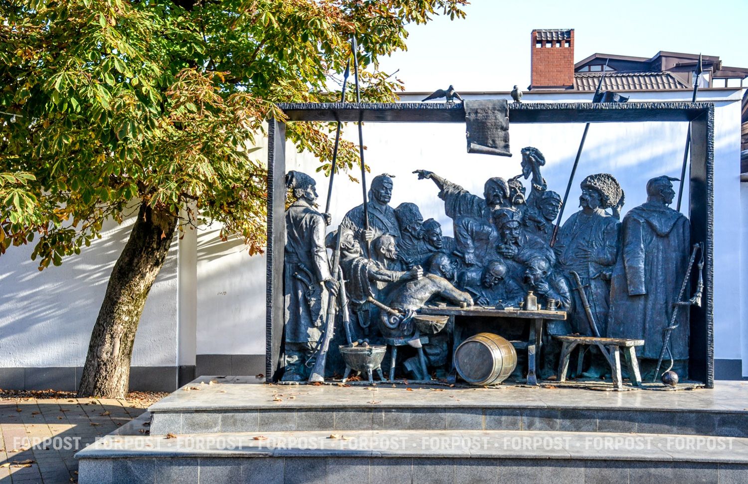 А за четыре года до того установили скульптурную композицию «Запорожские казаки пишут письмо турецкому султану» — да-да, копию знаменитой картины Ильи Репина — на углу улиц Красной и Горького. Приурочили это к 215-летию города.
