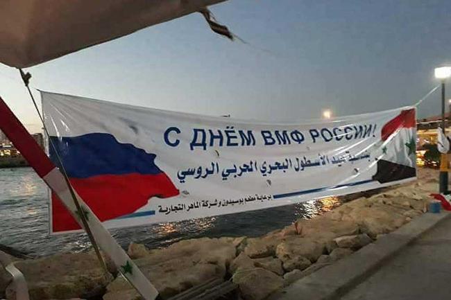 Также в честь Дня Военно-Морского Флота России в небе над акваторией порта Тартус пролетели самолеты Воздушно-космических сил России - фронтовые бомбардировщики Су-24М, многофункциональные истребители-бомбардировщики Су-34 и истребители Су-35С, базирующиеся на авиабазе "Хмеймим".
