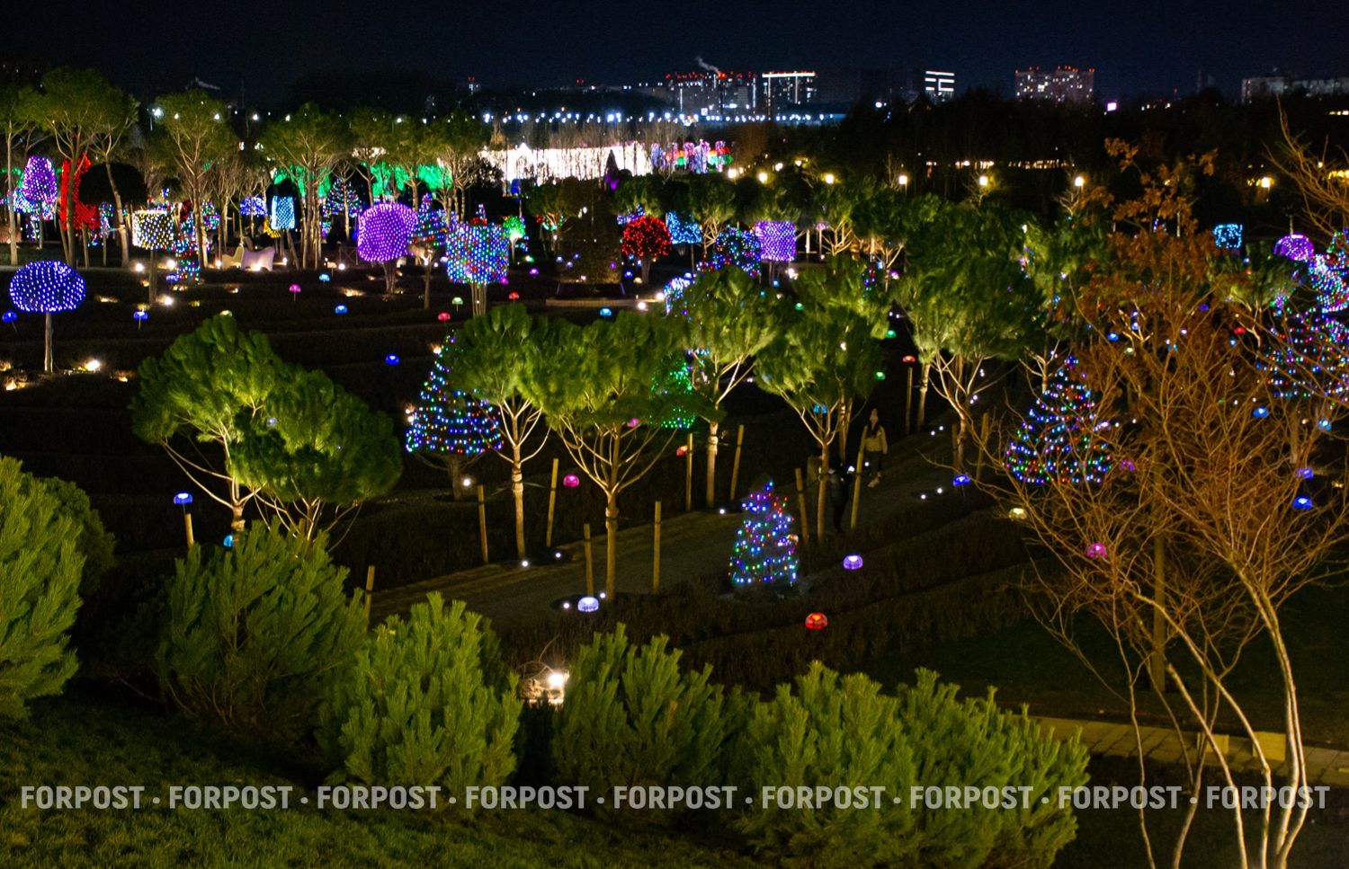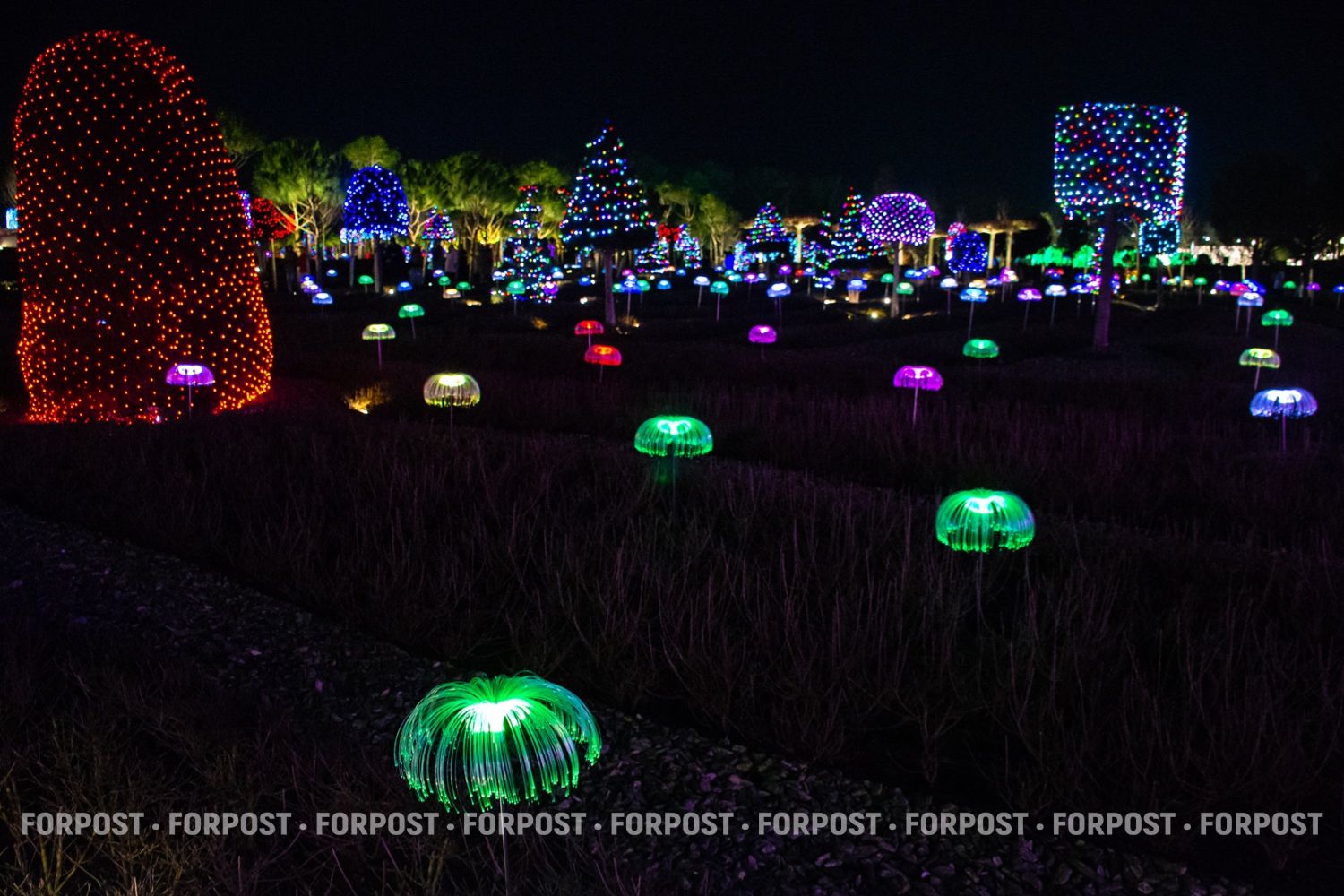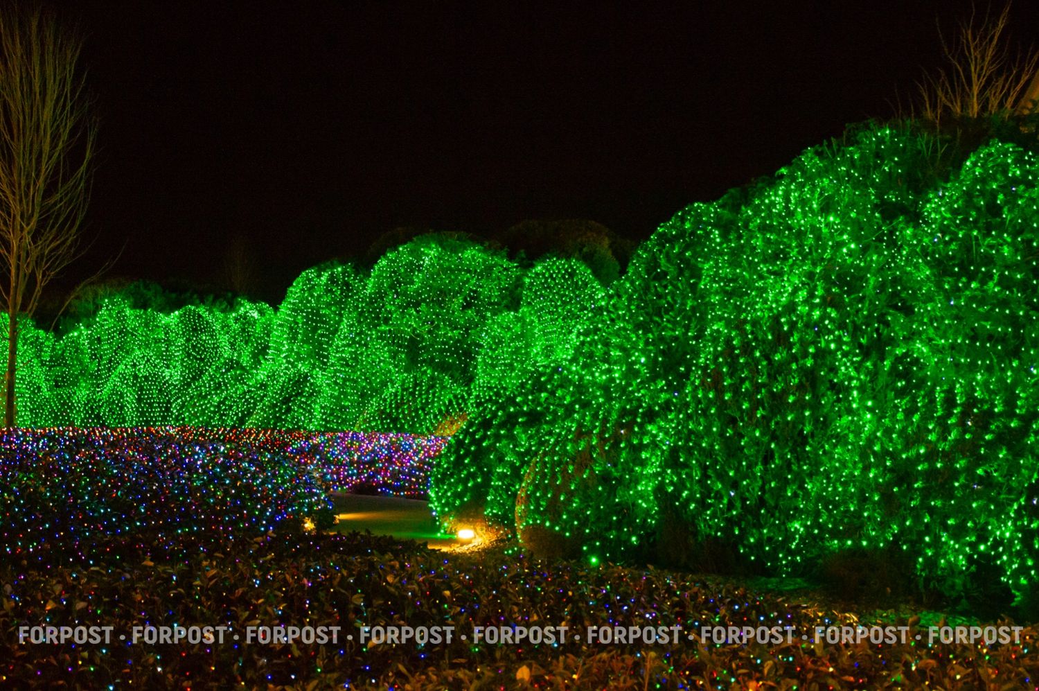 Световой декор здесь на каждом дереве и кустарнике. Они буквально укутаны в сетки-гирлянды с тысячами маленьких разноцветных лампочек.