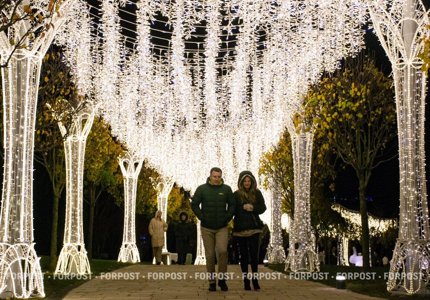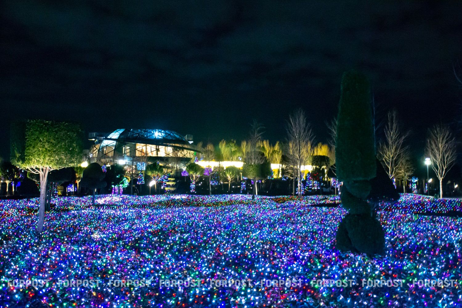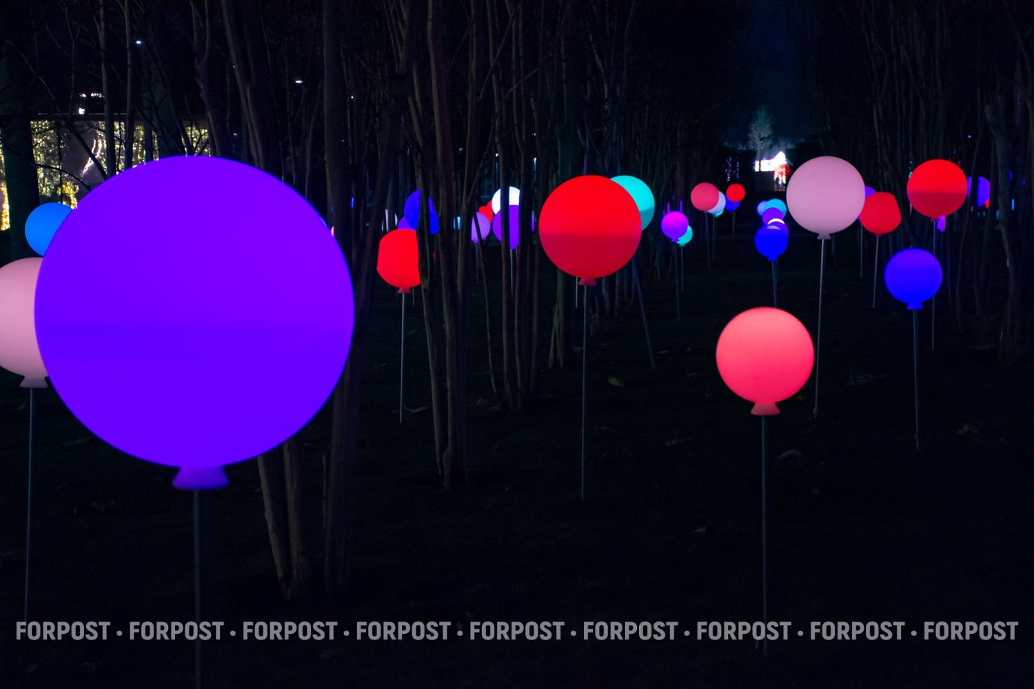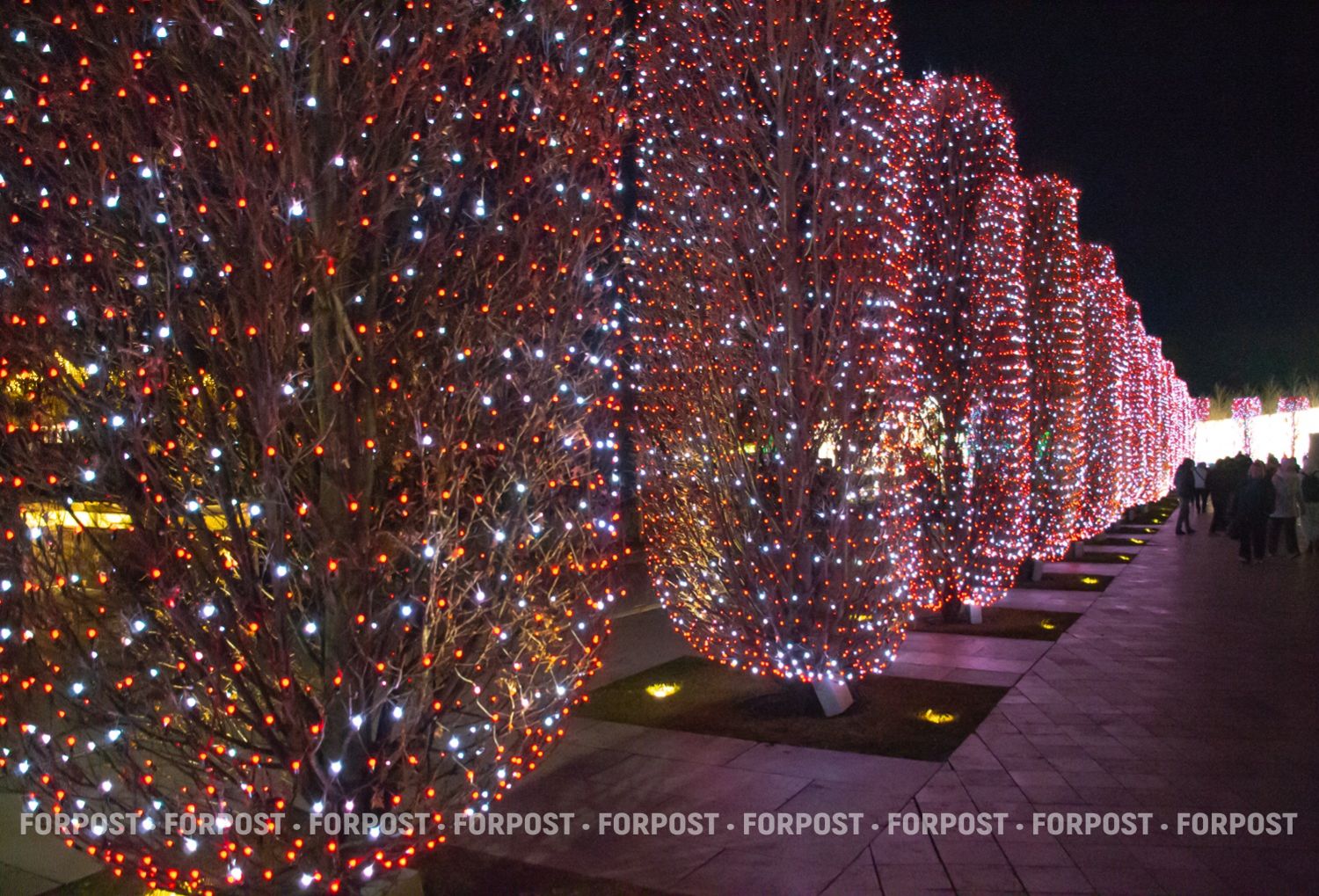 Световой декор здесь на каждом дереве и кустарнике. Они буквально укутаны в сетки-гирлянды с тысячами маленьких разноцветных лампочек.