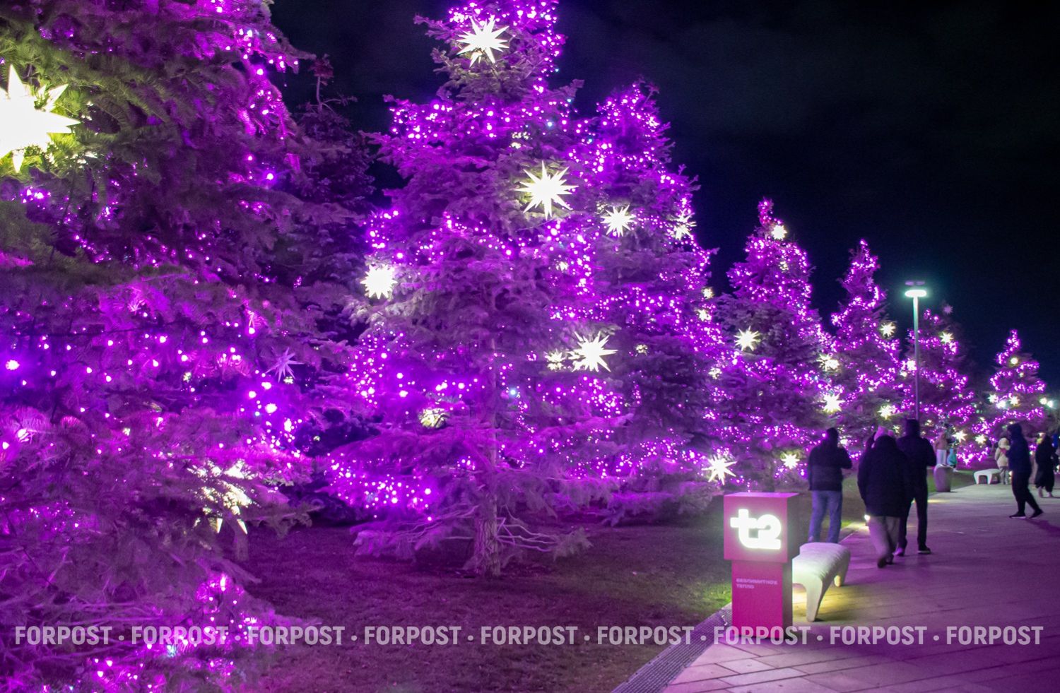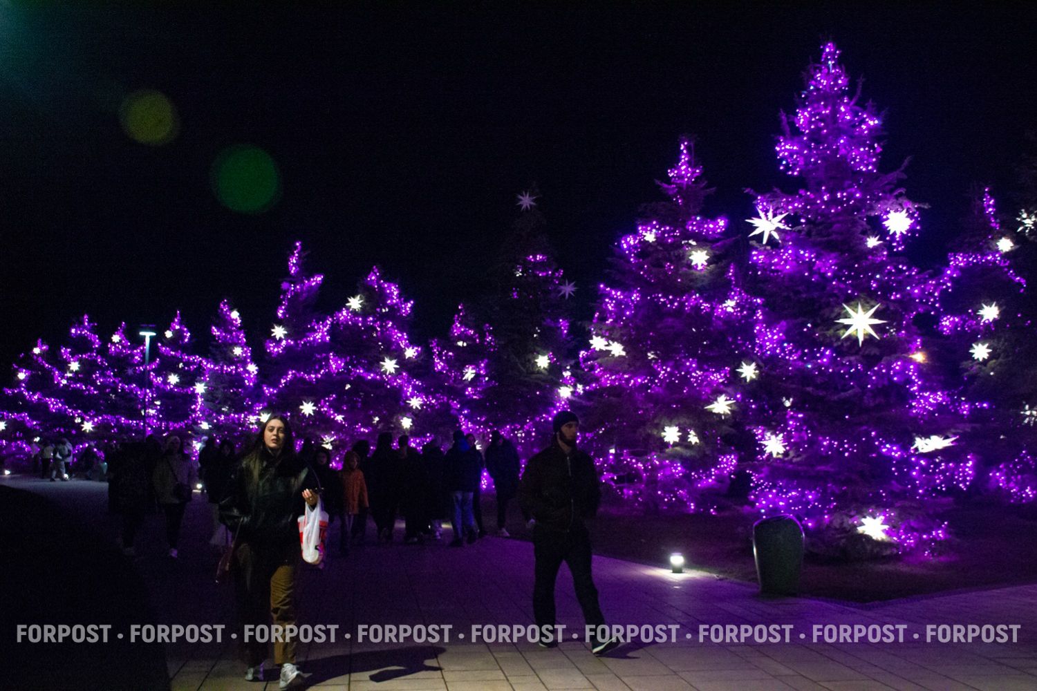 Они украшены специальными гирляндами, которые дают свет как будто с дымкой, и на их фоне выделяются белые звёзды.