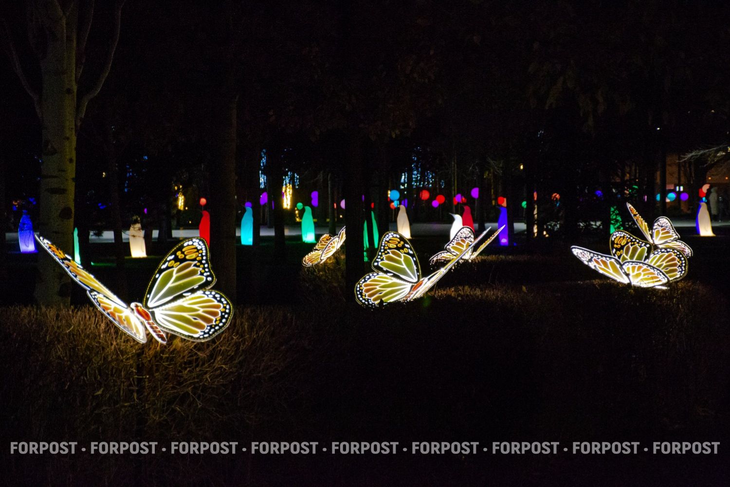 Например, раскрывшие крылья бабочки, возле которых – стая разноцветных пингвинов-светильников.