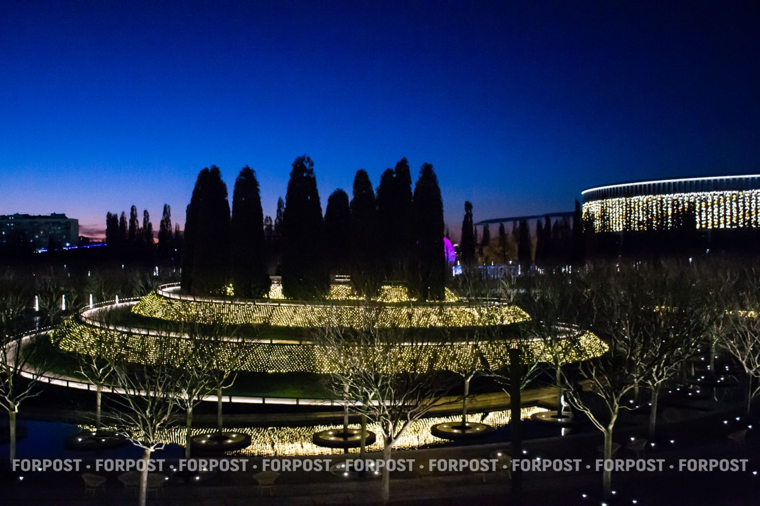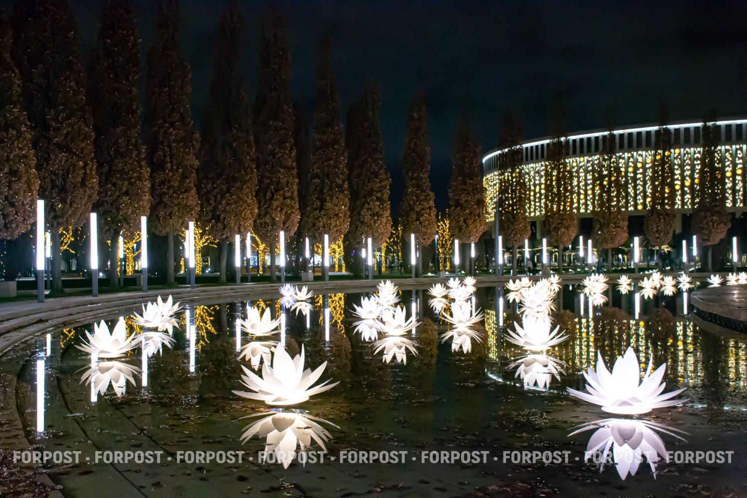 Или глядя снизу на террасы электронного шалфея, его на зиму высаживают вместо настоящего. Либо на водное поле светящихся лотосов в одном из прудов.