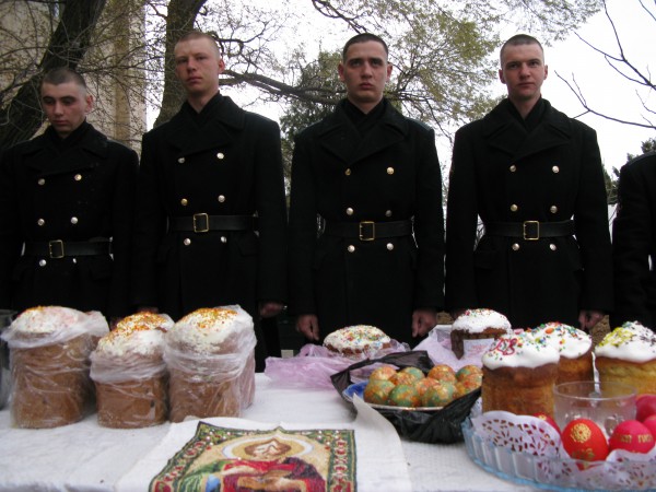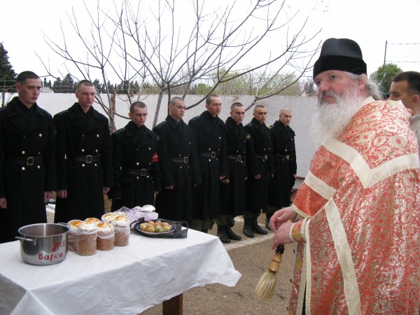 После литургии был совершен чин освящения куличей, пасок и яиц у стен храма, а затем отец Вячеслав по просьбе командира воинской части Черноморского флота РФ побывал в аэродромной роте морской авиации ЧФ, где провел короткую беседу с воинами, совершил чин освящения куличей, пасок и яиц.