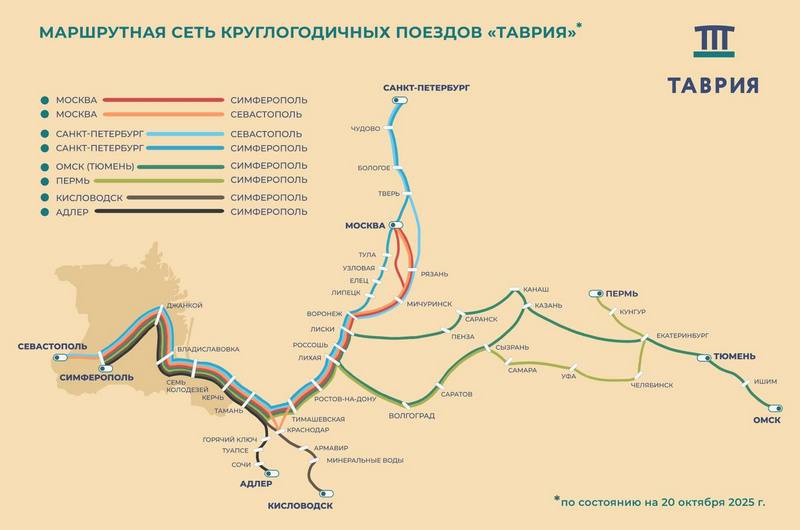 «Это четыре ежедневных поезда из Москвы, в их числе фирменный поезд «Таврия Экспресс», два ежедневных поезда из Петербурга и четыре поезда из других регионов (Адлер, Кисловодск, Омск/Тюмень, Пермь)», — перечислили в «Гранд Сервис Экспрессе».