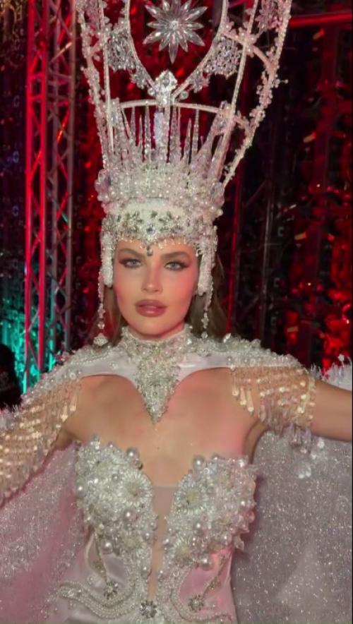 Национальный костюм «Русская зима» для Варвары сшила дизайнер из Новосибирска Яна Барвичуте. На это ушло три месяца: белый наряд вручную расшивали стразами и жемчугом. А завершала образ украшенная камнями трёхкилограммовая корона.