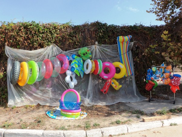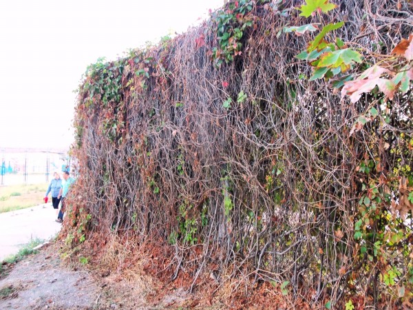 Так нещадно развешивался товар на ограде, увитой девичьим виноградом. Интересно, с чьего разрешения ?