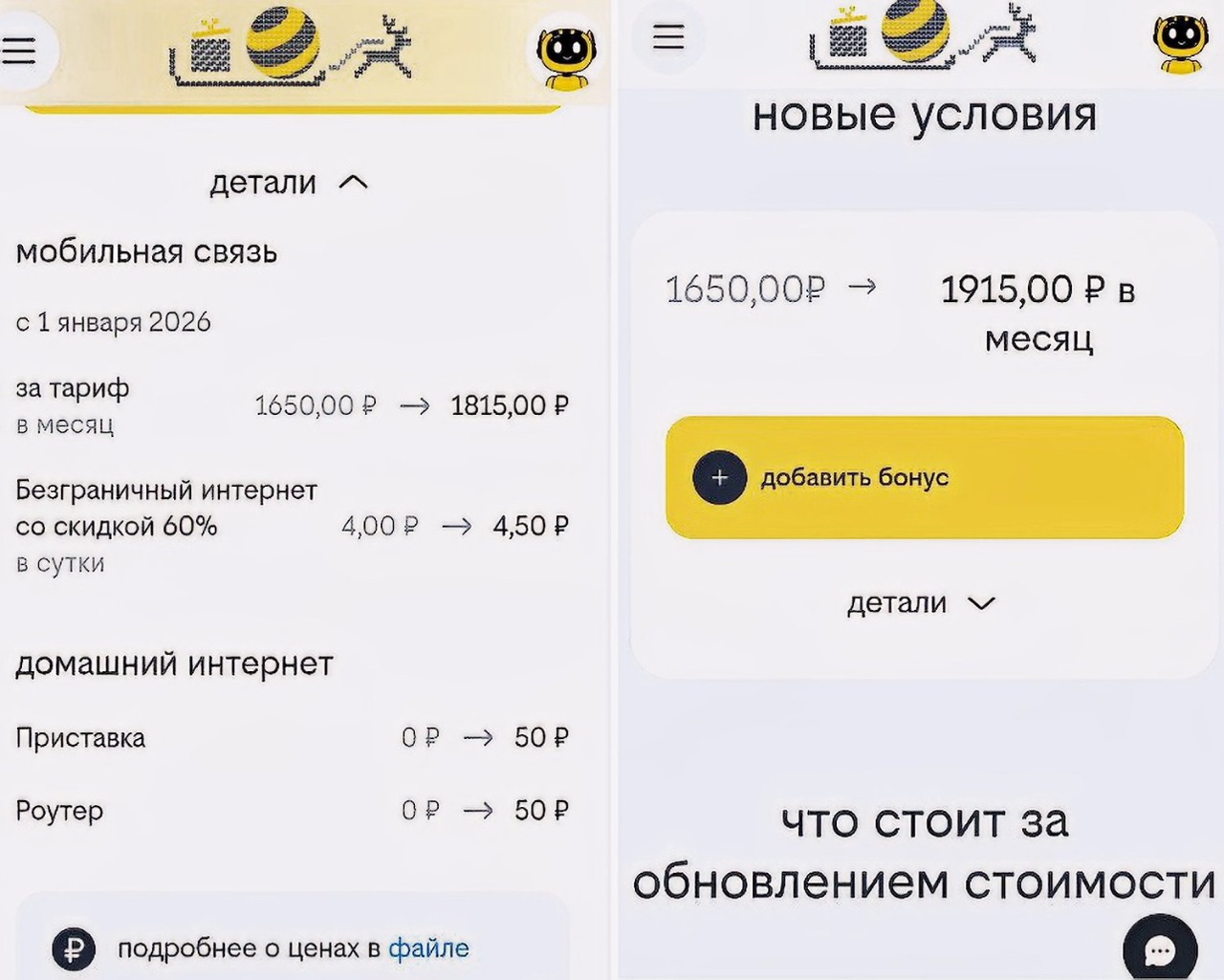 «Вы важны для нас, поэтому говорим честно. С 01.01.2026 обновится стоимость некоторых услуг, плата по тарифу составит 1815 р./мес. и гарантированно не изменится ближайшие 12 месяцев. При выставлении следующего счёта пересчитаем абонентскую плату с указанной даты по новым условиям».