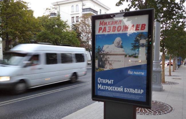 Врио губернатора Севастополя Михаил Развожаев, выдвинутый на предстоящие губернаторские выборы от партии «Единая Россия», не слишком активно использует символику партии в своих агитационных материалах, которые распространяются по городу.