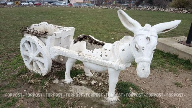 Сегодня от некогда привлекательной фотозоны мало что осталось: у ослика дыра в боку и торчит арматура, на остальных скульптурах облупилась краска.