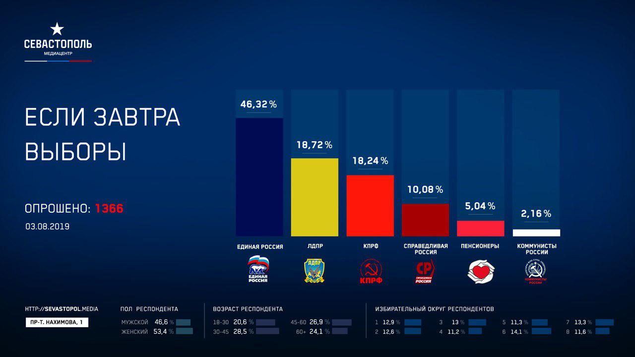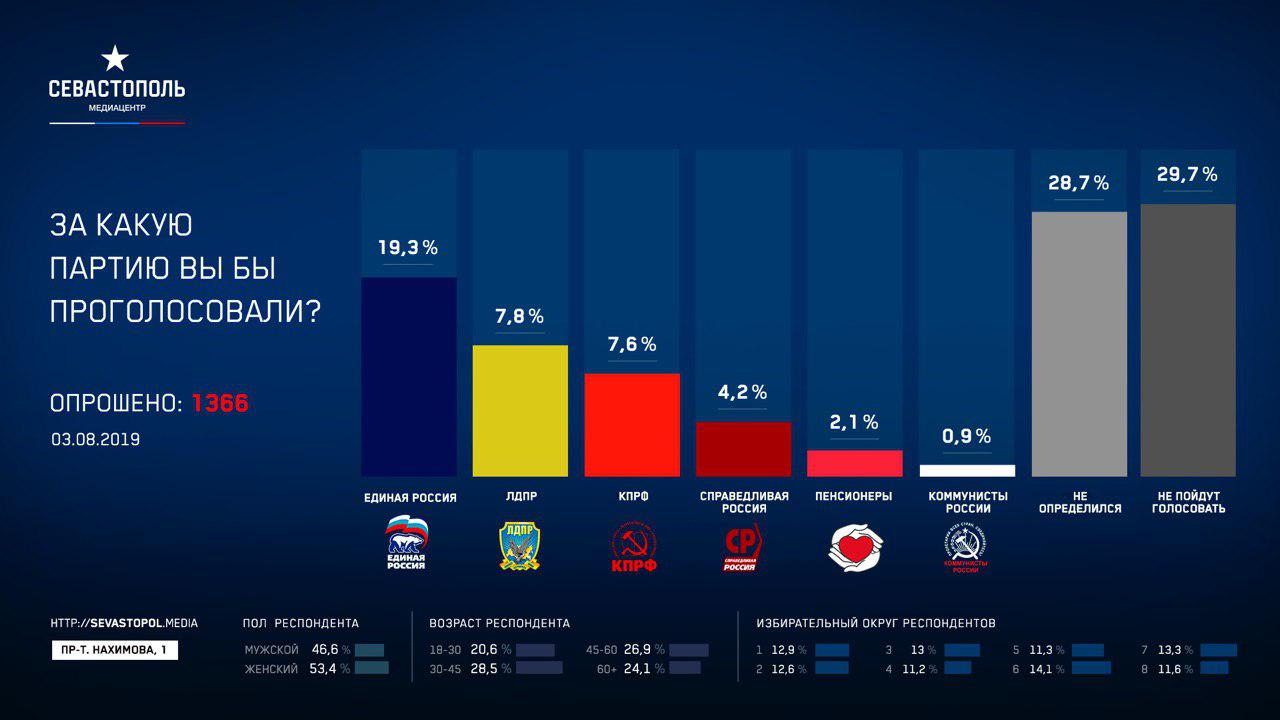 Результаты опроса говорят, что если бы выборы депутатов Законодательного собрания Севастополя второго созыва состоялись в ближайшее воскресенье, за партию «Единая Россия» проголосовало бы 19,3% избирателей, за ЛДПР – 7,8%, КПРФ – 7,6%, «Справедливую Россию» – 4,2%, «Партию пенсионеров» – 2,1%, «Коммунистов России» – 0,9%.