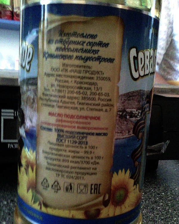- Мы с мужем днём в воскресенье, 21 июня, пошли по магазинам, - рассказала горожанка Александра. - В числе прочего решили взять подсолнечного масла. Стоим, изучаем витрину. И вдруг видим: «Севастопольское»! Спрашиваю шёпотом у мужа – где же его разливают-то? Он отвечает, дескать, где-то в Севастополе, наверное… Не тут-то было! Перевернули, а на этикетке красуется Краснодар. Взяли на пробу.