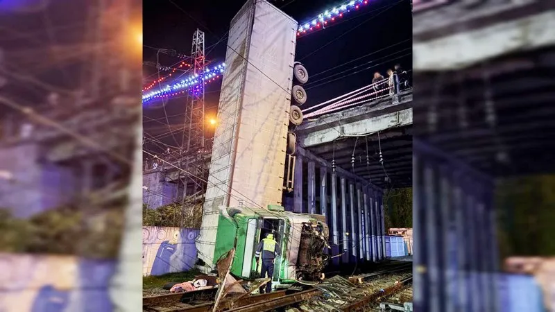 «В какой-то момент он не справился с управлением, в результате чего транспортное средство совершило наезд на пешеходное ограждение. После этого грузовик упал с автомобильного моста прямо на железнодорожные пути», — сообщили в МВД.